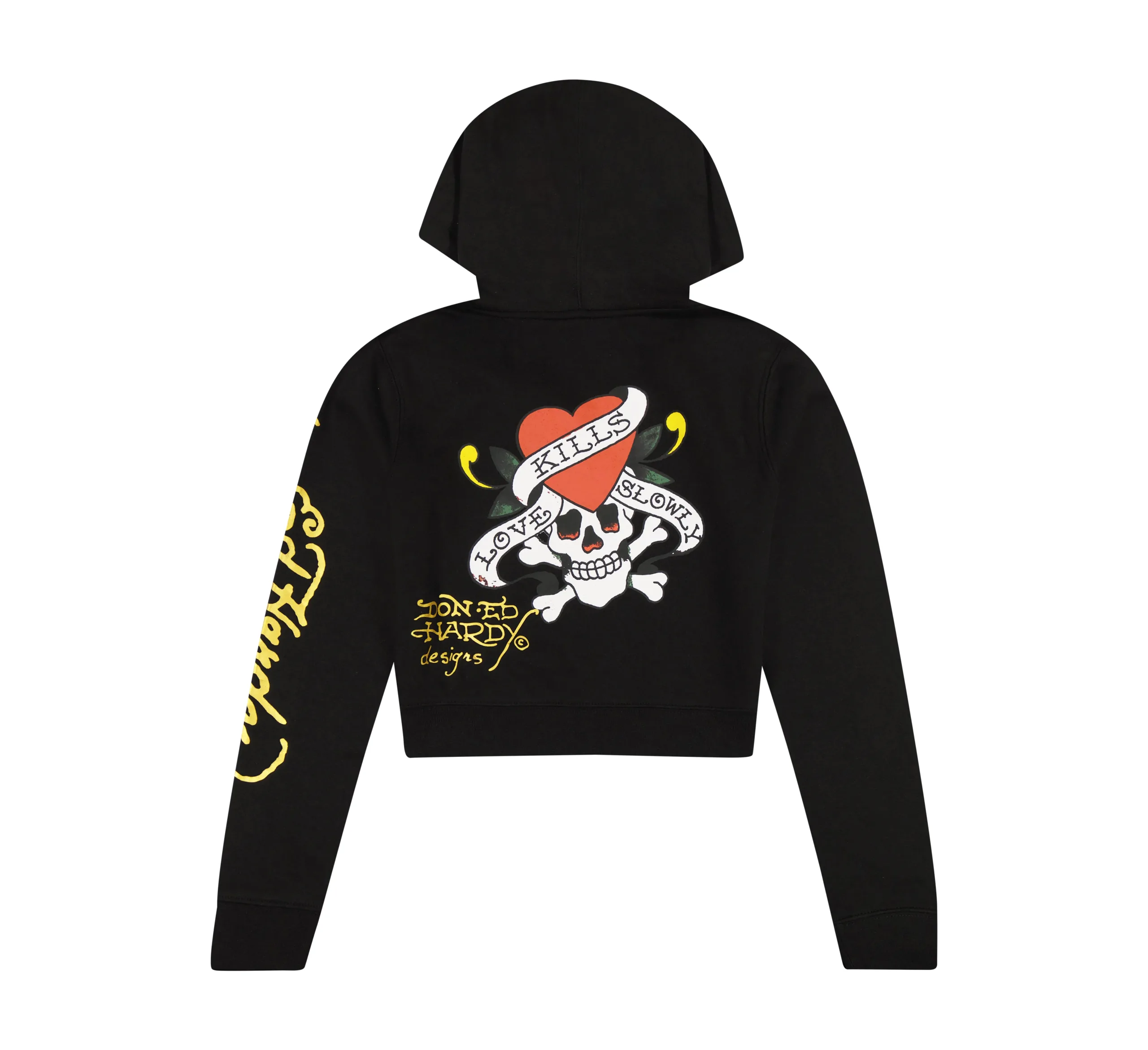 Ed Hardy’s fleece sets add a modern twist to the styles that reigned in the early 2000’s. This “Love Kills Slowly” black sweatshirt features a cropped fit complete with multiple signature graphics and a gold logo.