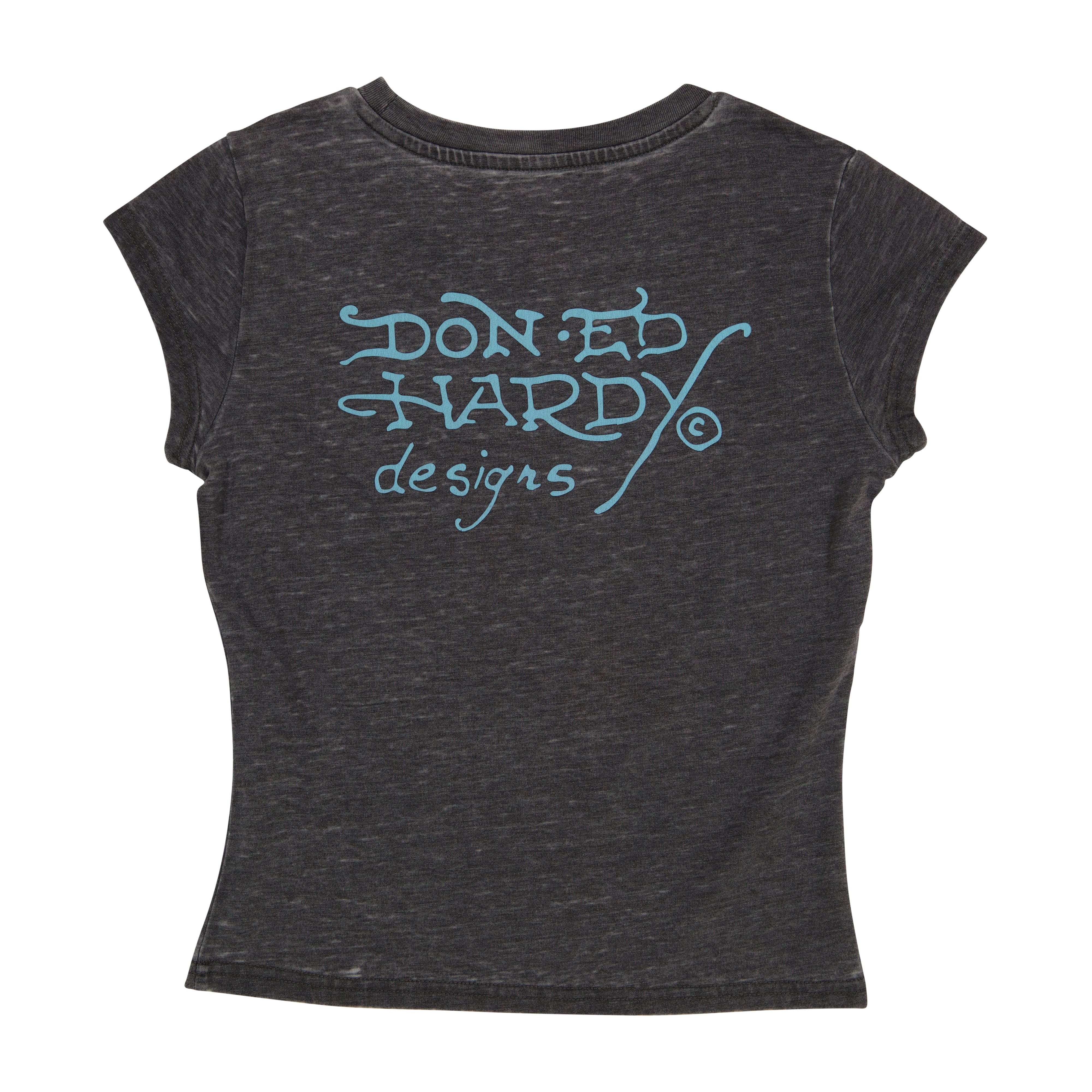 Cap sleeve fitted tee cropped at the waist. Crafted from a poly cotton burnout material to evoke a vintage feel. Complete with archival logos and layered Ed Hardy graphics.