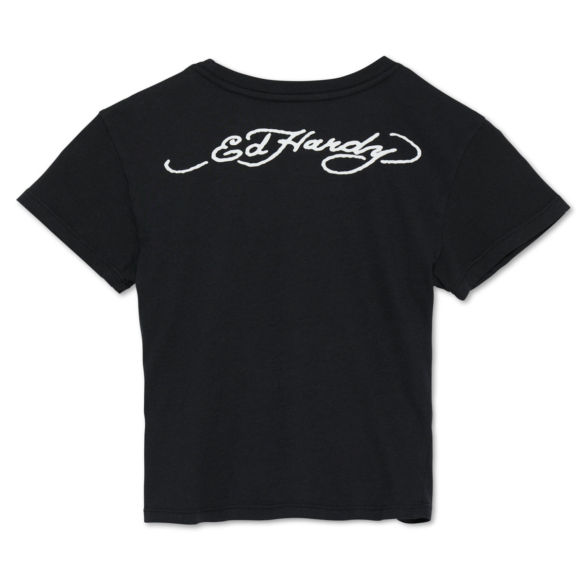 This cropped shrunken tee is made from the finest, super soft 100% cotton. Featuring Ed Hardy’s Iconic NYC Eagle Tattoo artwork on front and logo on back
