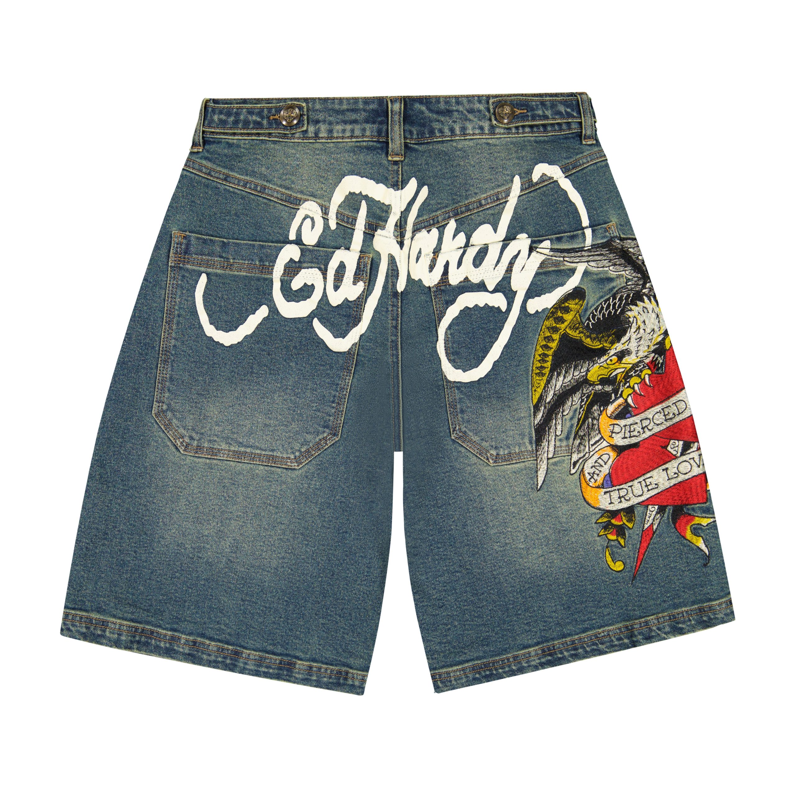 Jorts cut from a medium tint denim in a baggy fit. Features a pierced eagle graphic on side and signature logo on back in white.