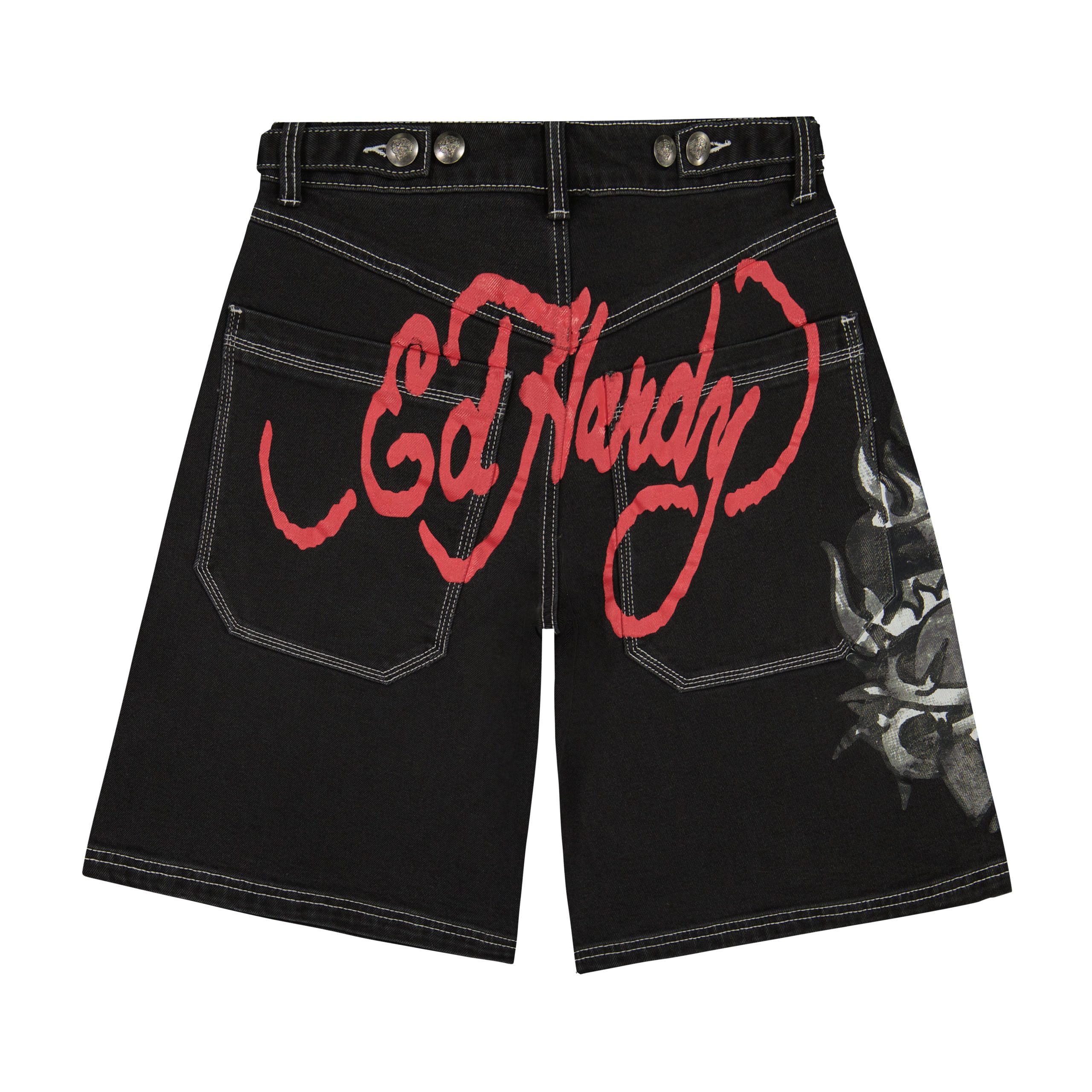 Jorts cut from a black denim in a baggy fit. Features a sacred heart graphic on side and signature logo on back in red.